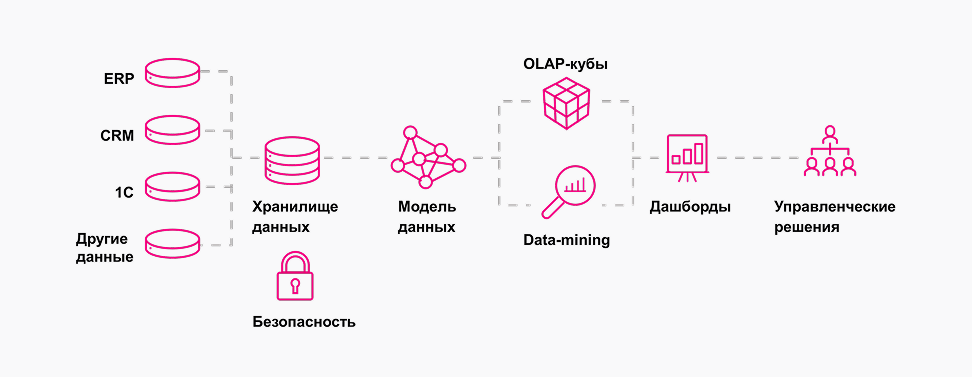 Данные из разных источников консолидируются, очищаются, трансформируются, агрегируются, классифицируются и загружаются в систему, где производится их анализ на основе отчетов и визуализаций
