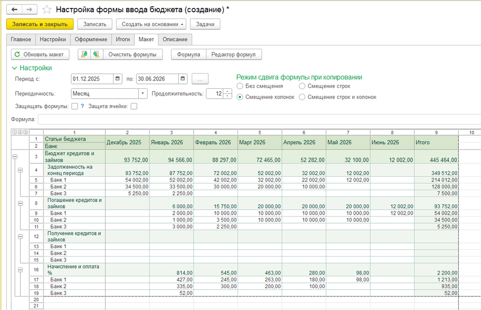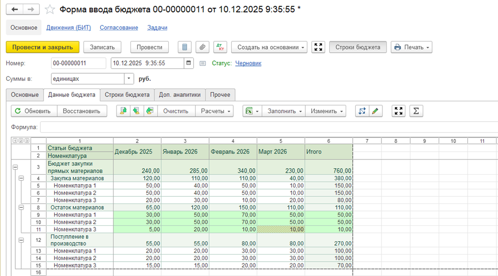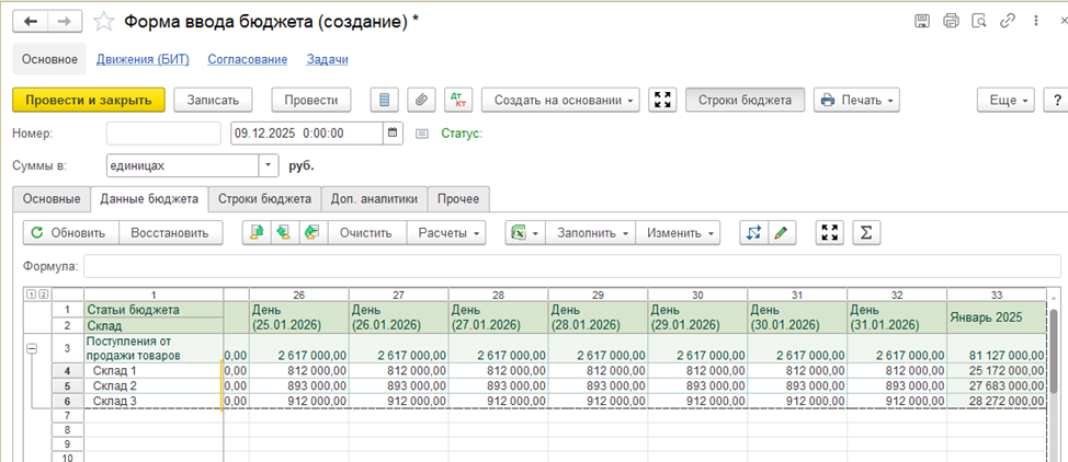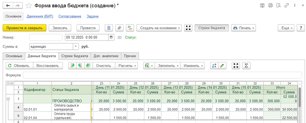 Бюджеты формируются непосредственно в системе: пользователь открывает бюджетный документ и вручную вводит плановые показатели. Такой способ удобен для оперативного планирования, корректировок и сценарных расчетов, когда важно быстро зафиксировать управленческие решения без промежуточных файлов и внешних инструментов.