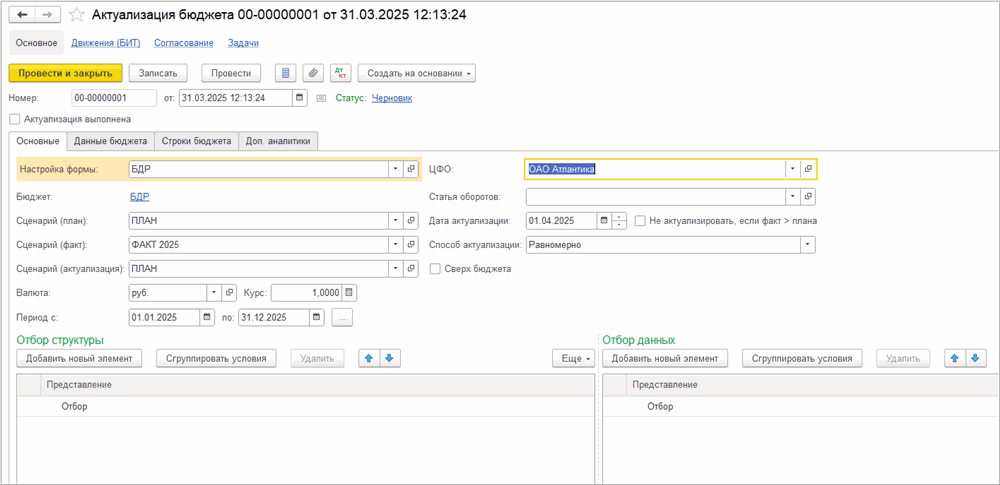 Актуализация применяется в ситуациях, когда часть периода уже закрыта фактом, а оставшийся план нужно пересчитать с учетом реальных данных. Пользователь указывает дату актуализации, например конец сентября, если фактические данные уже есть за девять месяцев. Система приравнивает план за прошедший период к факту, а разницу между планом и фактическими значениями перераспределяет на оставшийся период. Распределение может выполняться равномерно, пропорционально первоначальному плану, по заранее настроенному профилю распределения или вручную — в зависимости от выбранного подхода к управлению бюджетом.